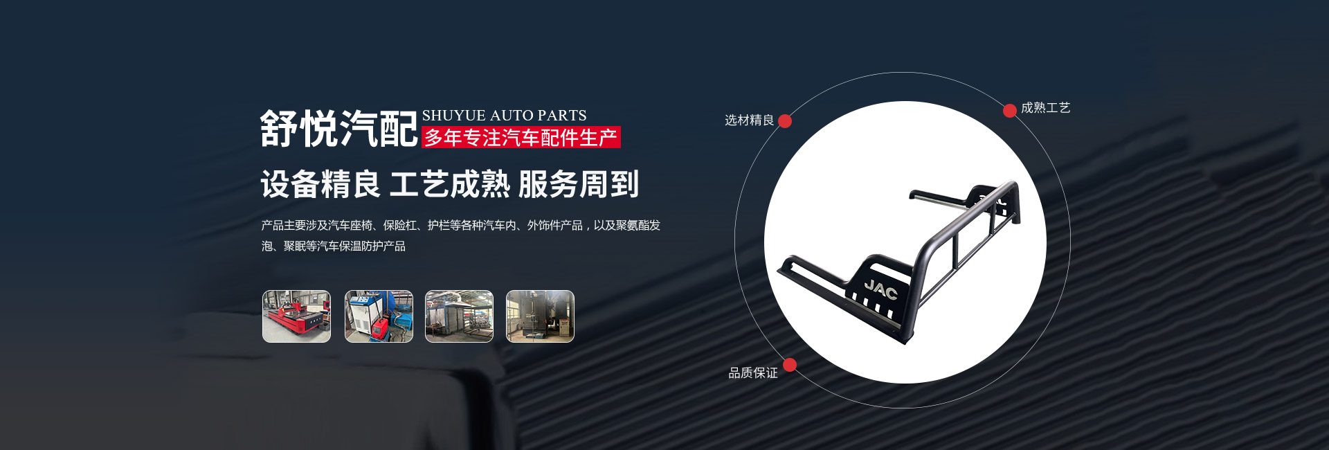 揚(yáng)州舒悅汽配有限公司經(jīng)過(guò)多年的穩(wěn)定發(fā)展,業(yè)績(jī)一直蒸蒸日上。公司產(chǎn)品主要涉及汽車(chē)座椅、保險(xiǎn)杠、護(hù)欄等各種汽車(chē)內(nèi)、外飾件產(chǎn)品,以及聚氨酯發(fā)泡、聚脲等汽車(chē)保溫防護(hù)產(chǎn)品。其主要是為江淮、金龍,奇瑞等公司服務(wù),已連續(xù)多年成為江淮、金龍等公司的A級(jí)供應(yīng)商。        公司成立于1997年,現(xiàn)坐落于揚(yáng)州市儀征劉集盤(pán)古工業(yè)集中區(qū)202號(hào),公司占地面積26640平 方米,廠(chǎng)房建筑面積18512平方米。公司擁有先進(jìn)的制造設(shè)備、可靠的生產(chǎn)工藝、完善的檢測(cè)手段和科學(xué)的管理,在售前和售后服務(wù)中做到快速反應(yīng),應(yīng)急應(yīng)變,為客戶(hù)提供優(yōu)良產(chǎn)品和滿(mǎn)意服務(wù)。公司的產(chǎn)品開(kāi)發(fā)能力和生產(chǎn)規(guī)模在同行業(yè)中處于前列的地位。        揚(yáng)州舒悅?cè)吮小罢\(chéng)信雙嬴”的原則,發(fā)揚(yáng)“誠(chéng)信、務(wù)實(shí)、創(chuàng)新、貢獻(xiàn)”的企業(yè)精神,恪守“顧客至上”的經(jīng)營(yíng)宗旨,致精從業(yè),不斷引進(jìn)新技術(shù)、新材料。以?xún)?yōu)良的產(chǎn)品、合理的價(jià)格和周到的服務(wù)參與市場(chǎng)競(jìng)爭(zhēng)。公司愿與國(guó)內(nèi)外朋友建立真誠(chéng)的合作伙伴關(guān)系,攜手共創(chuàng)輝煌!